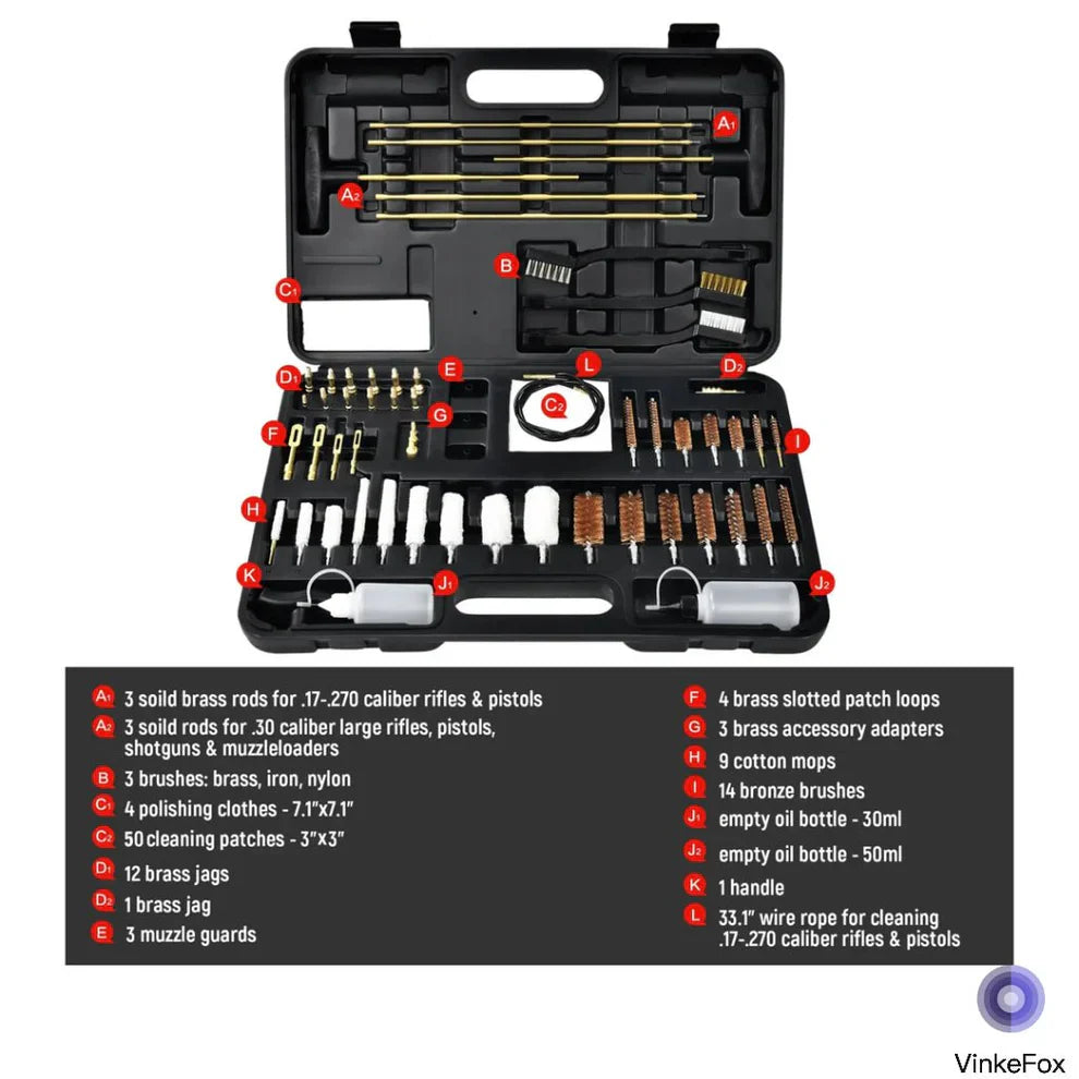 This cleaning kit covers all calibers and helps you clean all guns, such as pistols, rifles, and shotguns. The kit's internal accessories are well laid out, with each accessory you need neatly placed in its compartment, the accessories and case are marked with caliber scales that can easily be put back in place after use. Whether you're a novice or an experienced shooter, it's easy to use.